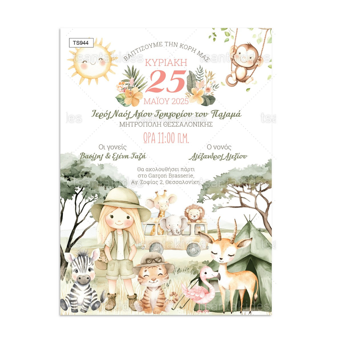 Προσκλητήριο βάπτισης για κορίτσι Εξερευνήτρια με Ζωάκια του Δάσους.