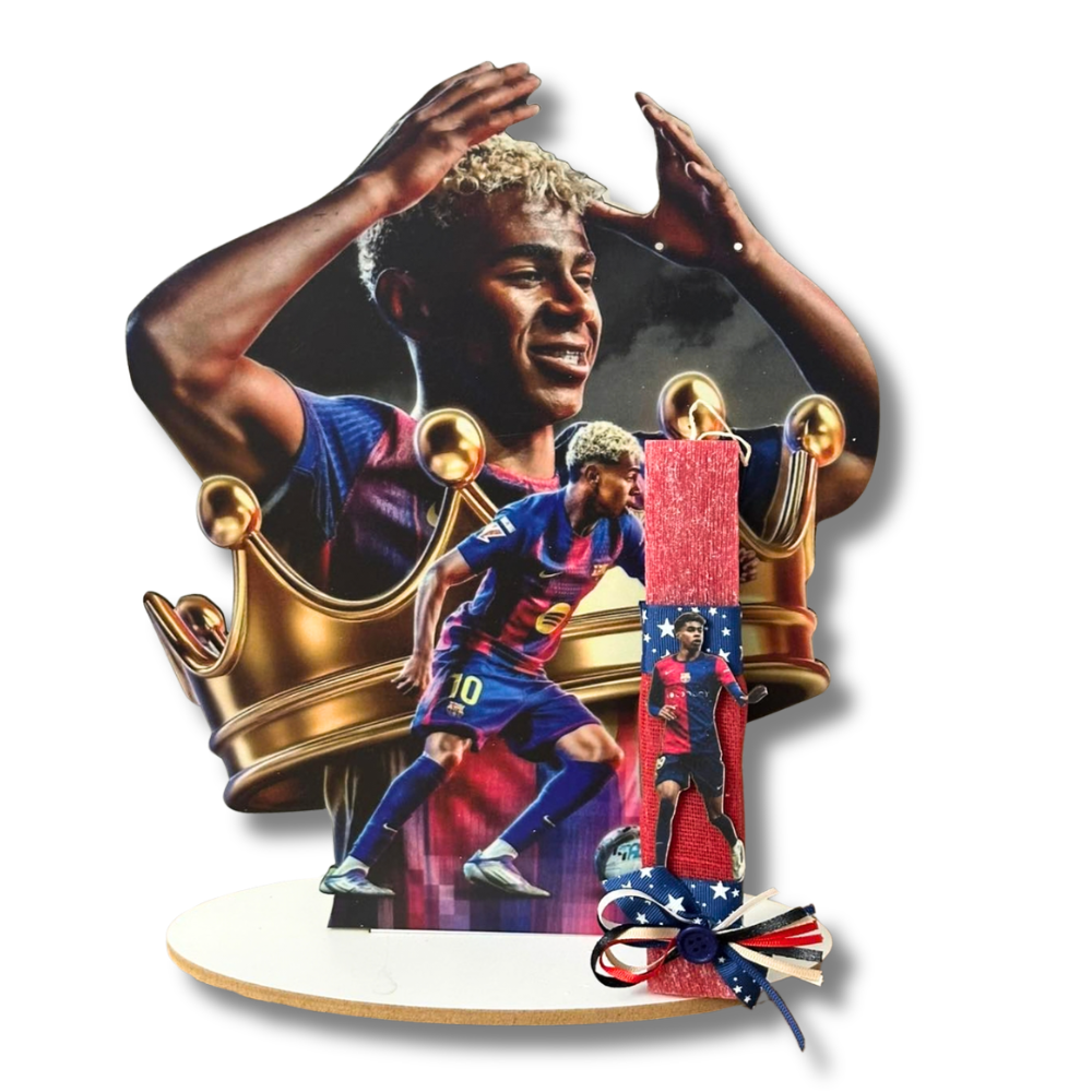Χαρίστε ένα ξεχωριστό Πάσχα με μια μοναδική, χειροποίητη πασχαλινή λαμπάδα για αγόρι στο θέμα Ποδοσφαιριστής Ομάδας, διακοσμημένη με ξύλινη πλάτη στο ίδιο ύφος.