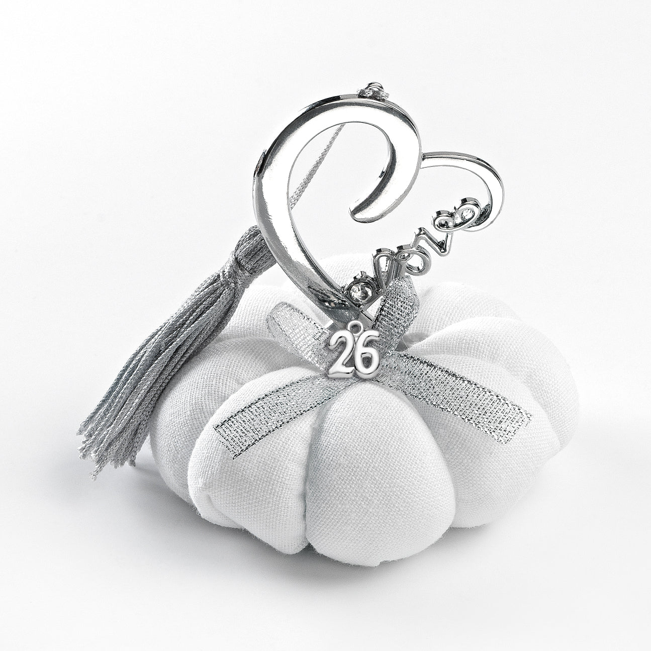 Χειροποίητη Κολοκύθα υφασμάτινη Γούρι 2026 με μεταλλική Καρδιά με Στρας, σε Ασημί χρώμα και φούντα περίπου Δ9εκ.