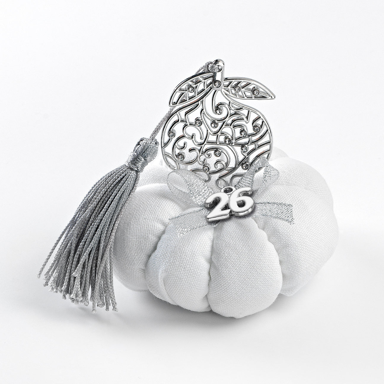 Χειροποίητη Κολοκύθα υφασμάτινη Γούρι 2026 με μεταλλικό Ρόδι με Στρας, σε Ασημί χρώμα και φούντα περίπου Δ9εκ.