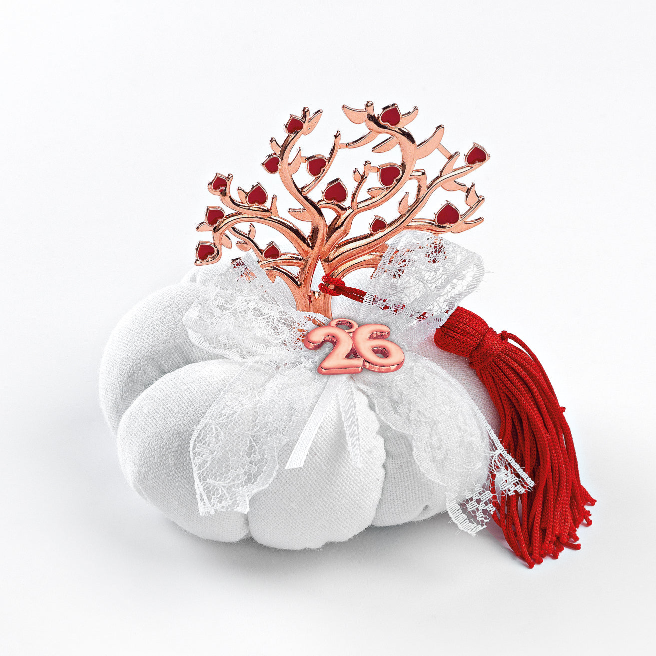 Χειροποίητη Κολοκύθα υφασμάτινη Γούρι 2026 με μεταλλικό Δέντρο με Κόκκινες Καρδιές, σε Ροζ Χρυσό χρώμα και φούντα περίπου Δ9εκ.