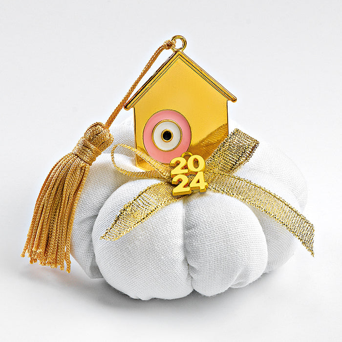 Χειροποίητη Κολοκύθα υφασμάτινη Γούρι 2026 με μεταλλικό Σπιτάκι με Ροζ Μάτι , σε Χρυσό χρώμα και φούντα περίπου Δ9εκ.