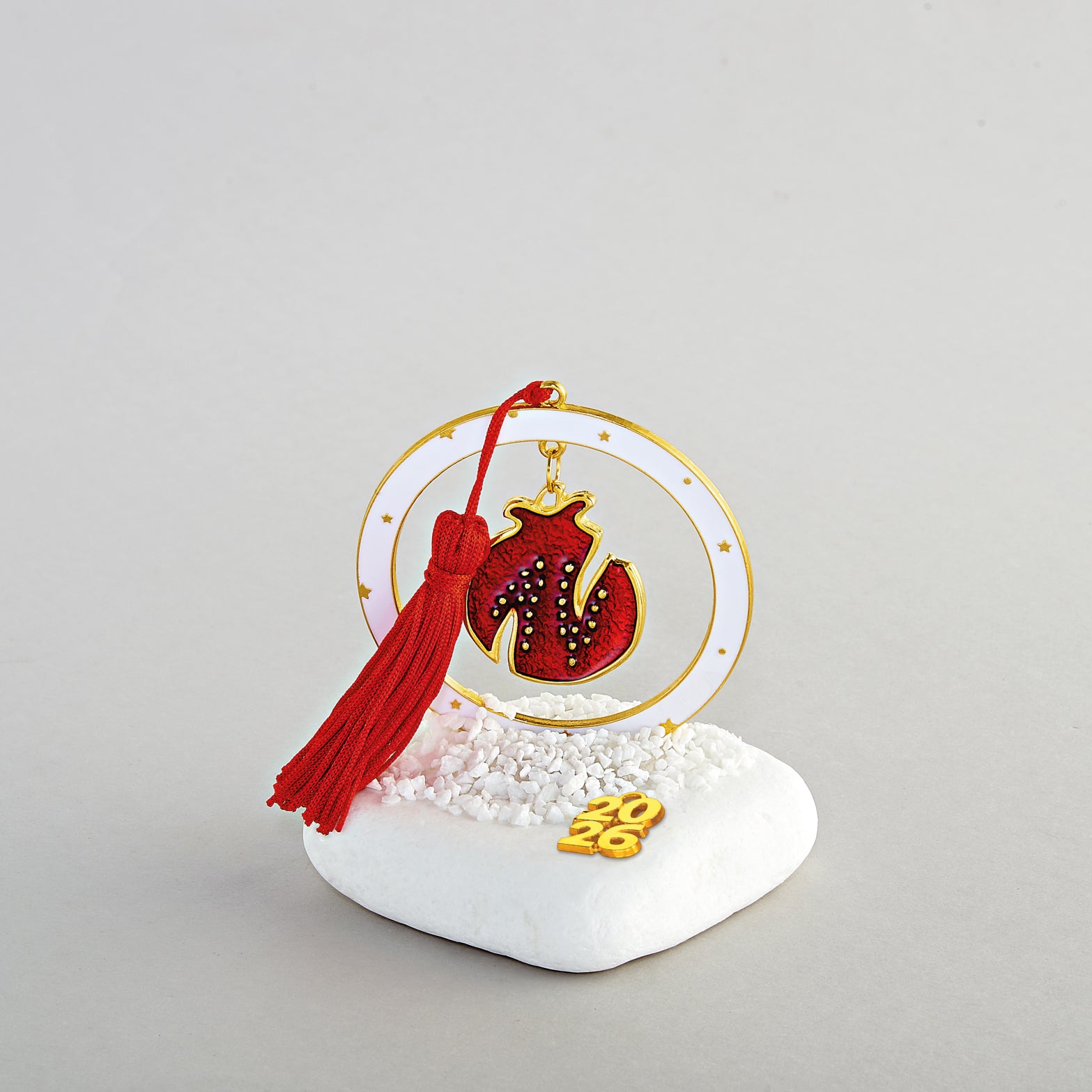 Χειροποίητο Επιτραπέζιο Γούρι 2026 βότσαλο με μεταλλικό κύκλο λευκό με αστέρια, φούντα & Ρόδι περίπου Υ9εκ.