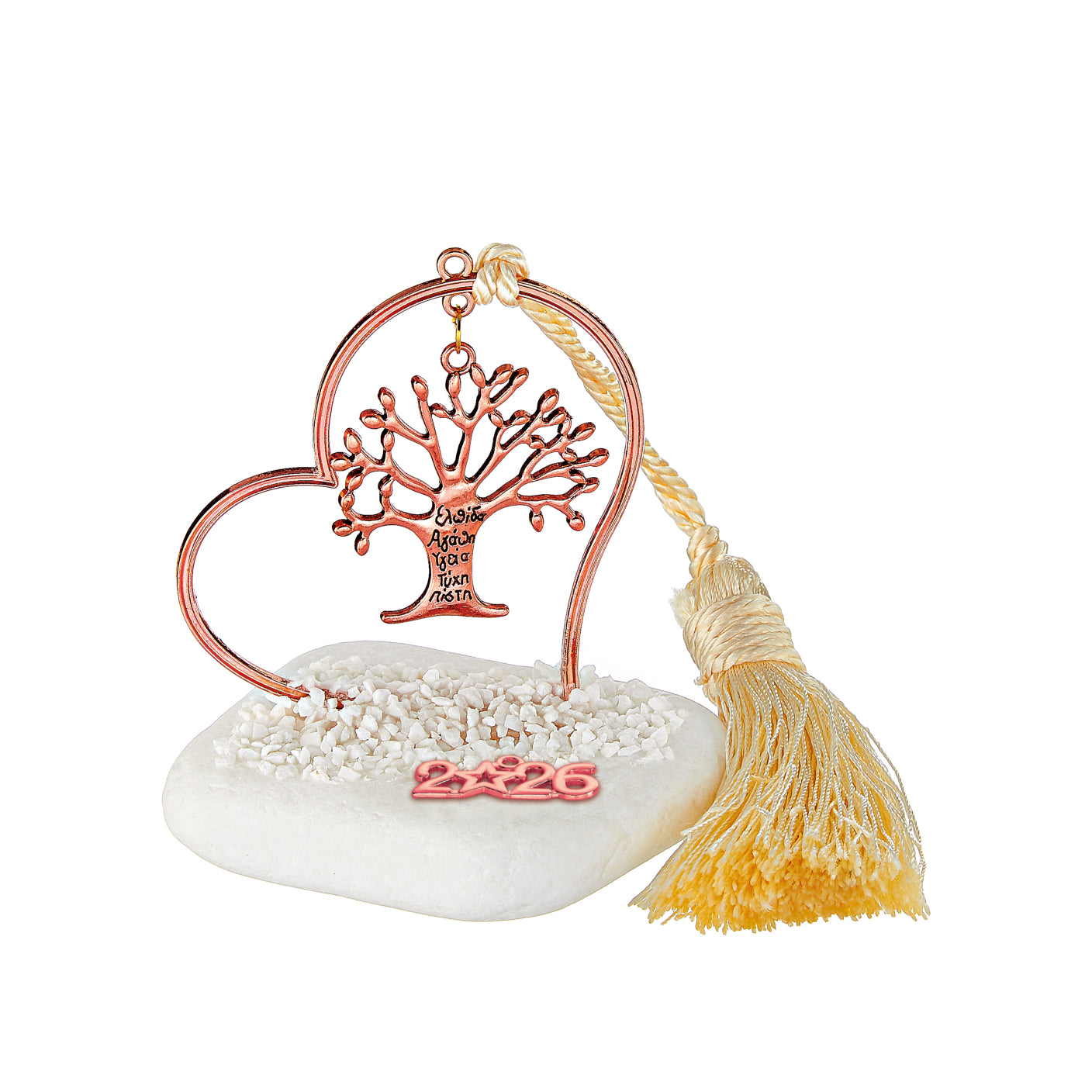 Χειροποίητο Επιτραπέζιο Γούρι 2026 βότσαλο με μεταλλικό Περίγραμμα Καρδιά, φούντα & Δέντρο με Ευχές ροζ χρυσό χρώμα περίπου Υ10εκ.