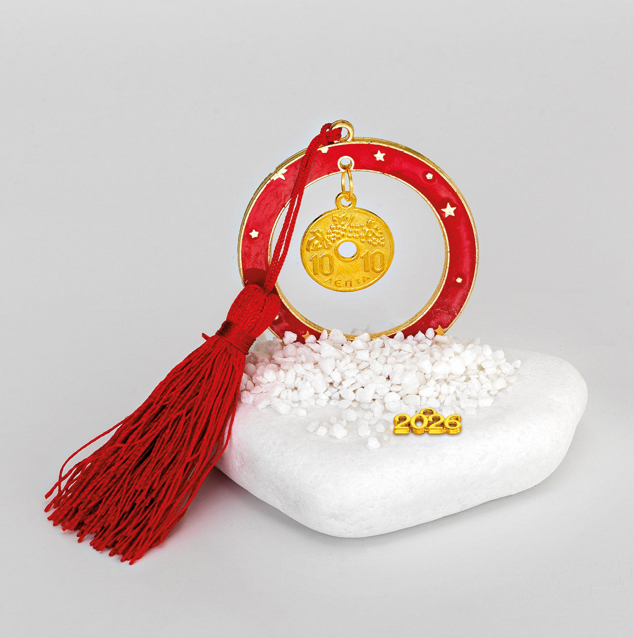 Χειροποίητο Επιτραπέζιο Γούρι 2026 βότσαλο με κύκλο Κόκκινο & Δεκάρα χρυσή Υ9εκ.