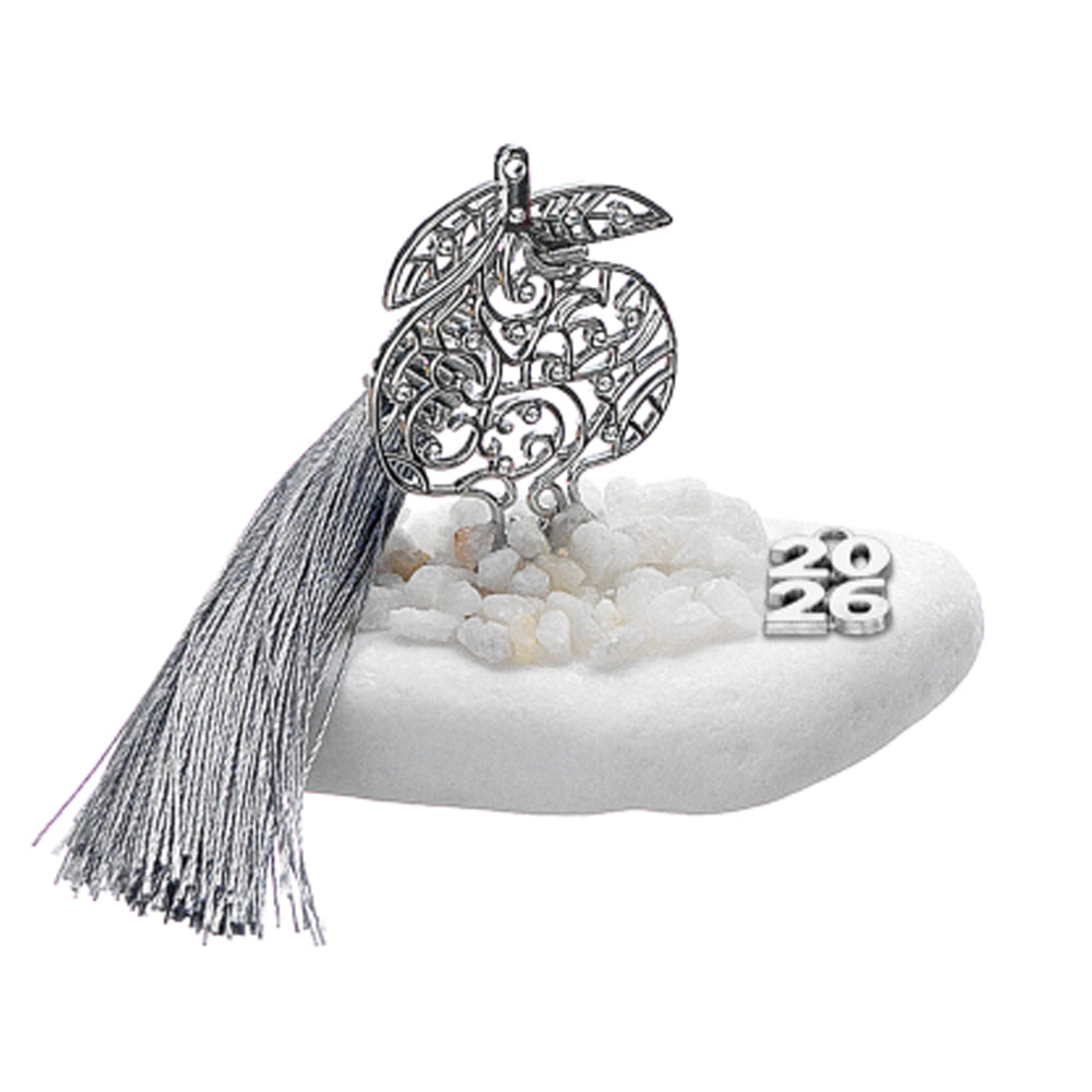 Χειροποίητο γούρι 2026 , επιτραπέζιο διακοσμητικό σε πέτρα, ρόδι με στρας σε ασημένιο χρώμα με ασημί φούντα, περίπου Υ8εκ.