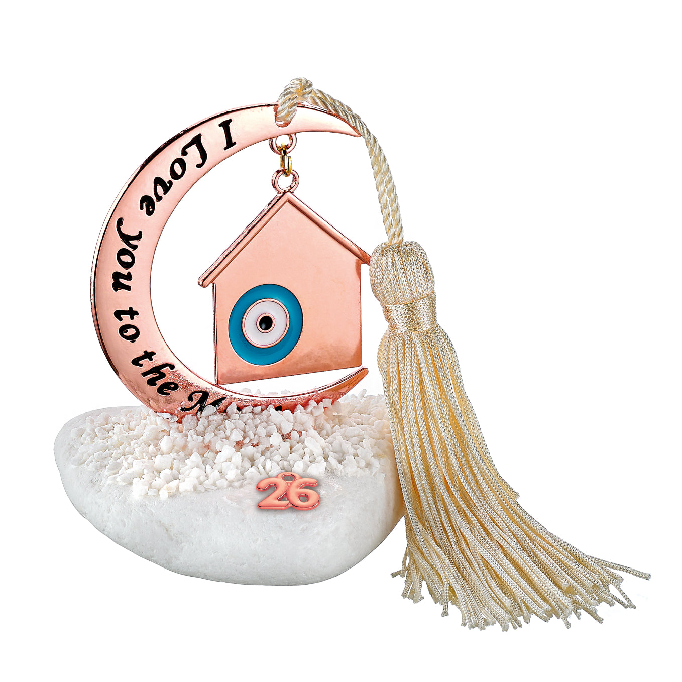 Χειροποίητο Επιτραπέζιο Γούρι 2026 σε βότσαλο με μεταλλικό ροζ χρυσό Μισοφέγγαρο I love you to the moon 7X8εκ & μεταλλικό Σπιτάκι ροζ χρυσό χρώμα με Ροζ Μάτι 5Χ4εκ και φούντα. Συνολικό ύψος περίπου Υ10εκ.