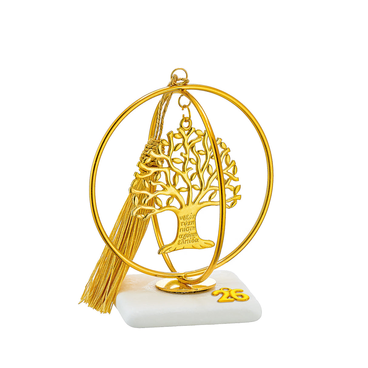 Χειροποίητο Επιτραπέζιο Γούρι 2026 σε φυσικό Μάρμαρο 7x7x1εκ με μεταλλικό χρυσό Τ. Κλουβί 10X12εκ & μεταλλικό Δέντρο Ζωής με Ευχές χρυσό  7Χ7εκ και φούντα. Συνολικό ύψος περίπου Υ13εκ.