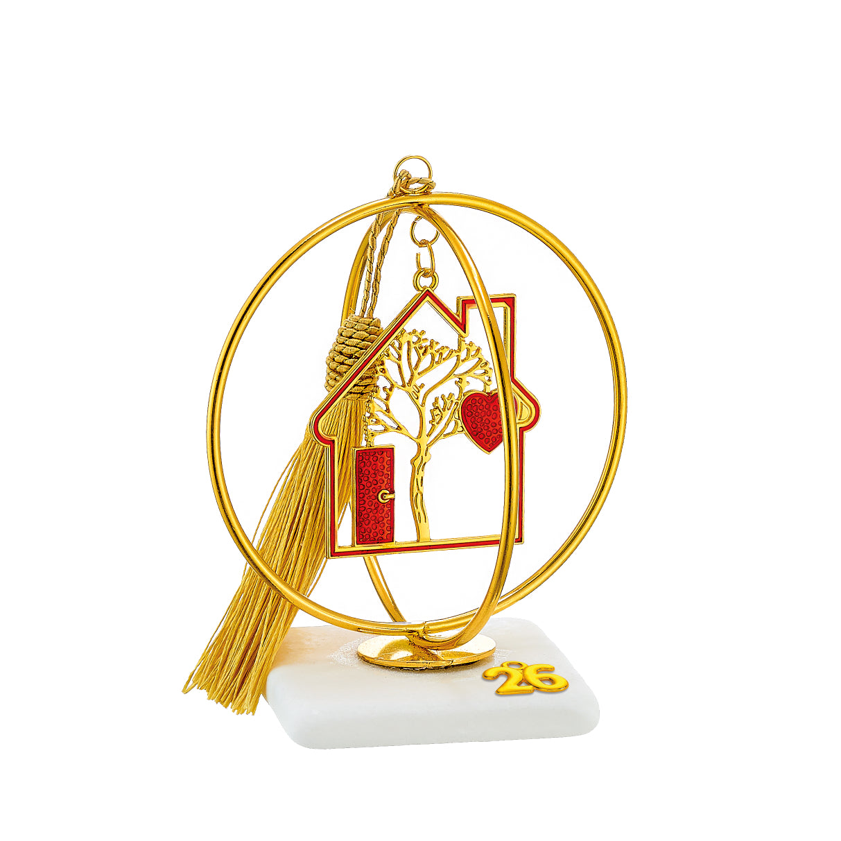 Χειροποίητο Επιτραπέζιο Γούρι 2026 σε φυσικό Μάρμαρο 7x7x1εκ με μεταλλικό χρυσό Τ. Κλουβί 10X12εκ & μεταλλικό Σπιτάκι με Καρδιά Κόκκινη 5,5Χ6,5εκ και φούντα. Συνολικό ύψος περίπου Υ13εκ.
