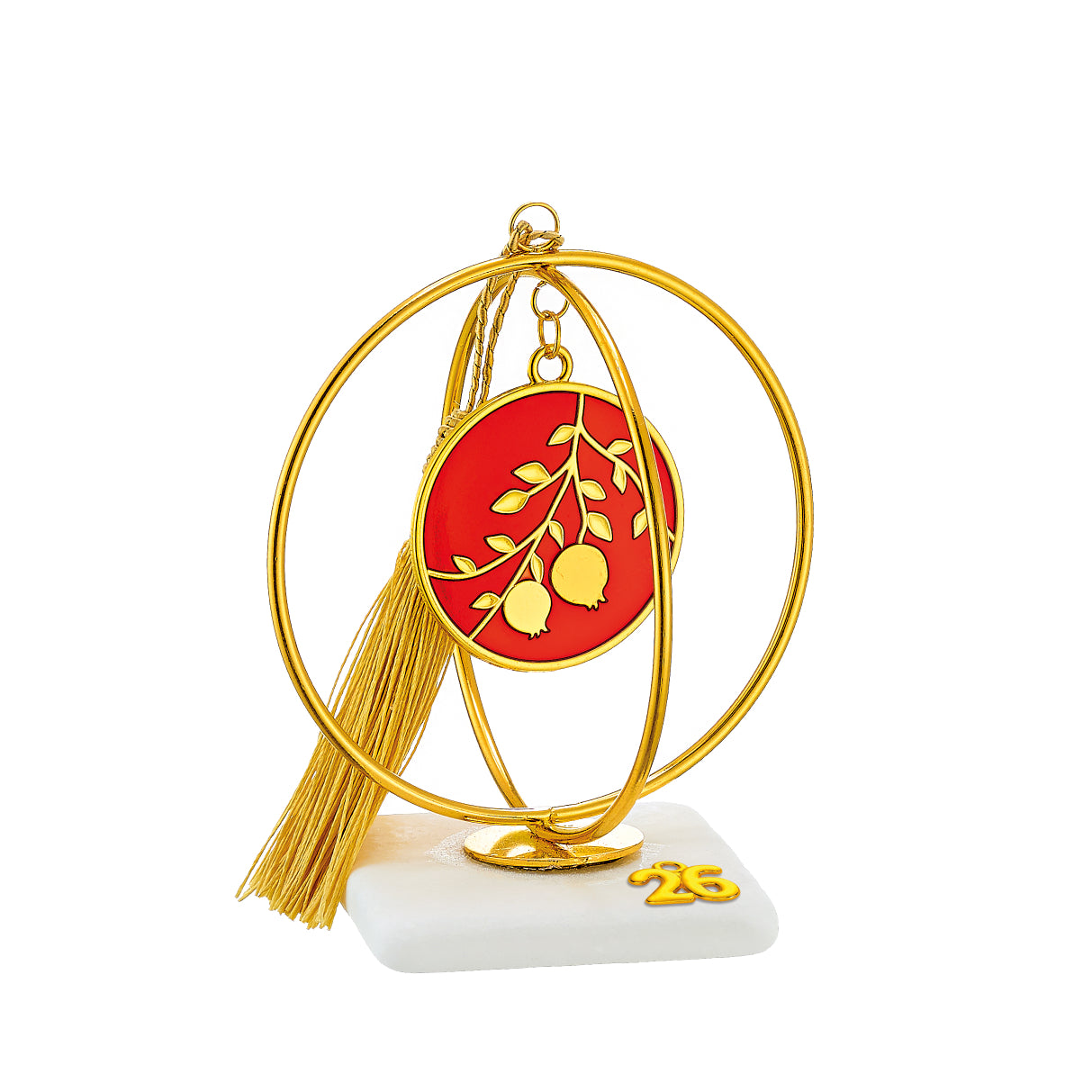 Χειροποίητο Επιτραπέζιο Γούρι 2026 σε φυσικό Μάρμαρο 7x7x1εκ με μεταλλικό χρυσό Τ. Κλουβί 10X12εκ & μεταλλικό Στρογγυλό Διακοσμητικό κόκκινο με Κλαδιά & Ρόδια 4,5Χ5,5εκ και φούντα. Συνολικό ύψος περίπου Υ13εκ.