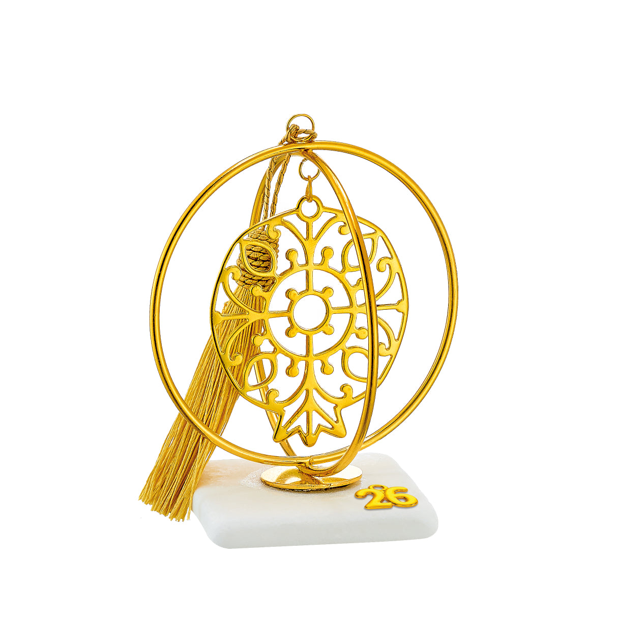 Χειροποίητο Επιτραπέζιο Γούρι 2026 σε φυσικό Μάρμαρο 7x7x1εκ με μεταλλικό χρυσό Τ. Κλουβί 10X12εκ & μεταλλικό Ρόδι χρυσό Μάνταλα 6,5Χ8εκ και φούντα. Συνολικό ύψος περίπου Υ13εκ.