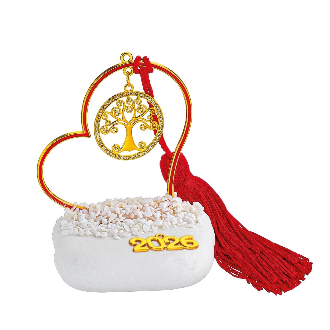 Χειροποίητο Επιτραπέζιο Γούρι 2026 Βότσαλο με μεταλλικό Περίγραμμα Καρδιά Κόκκινη σμάλτο, φούντα & Δέντρο Ζωής με Στρας Χρυσό χρώμα περίπου Υ10εκ.