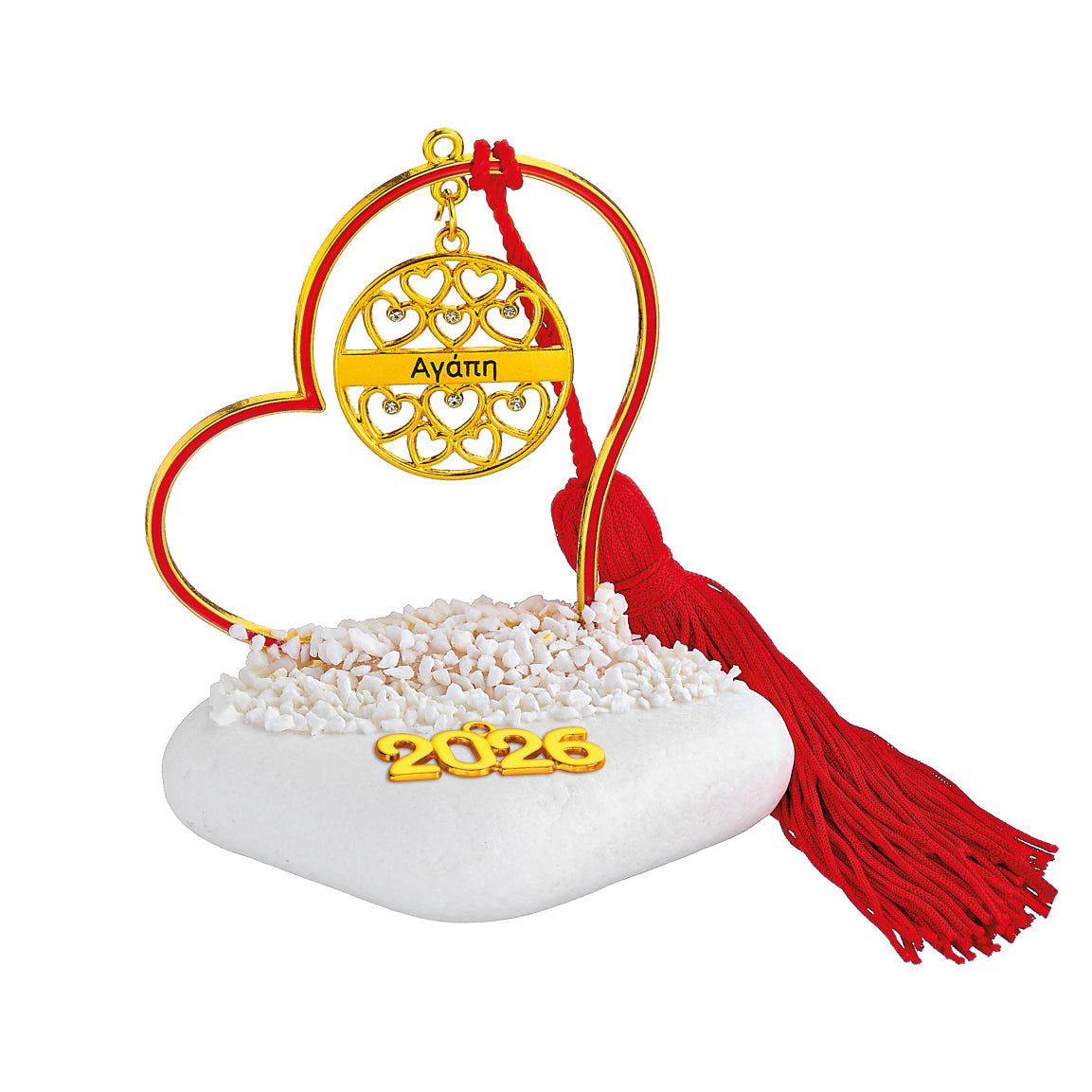 Χειροποίητο Επιτραπέζιο Γούρι 2026  Βότσαλο με μεταλλικό Περίγραμμα Καρδιά Κόκκινη σμάλτο, φούντα & Κύκλος με καρδιές και τη λέξη Αγάπη Χρυσό χρώμα περίπου Υ10εκ.