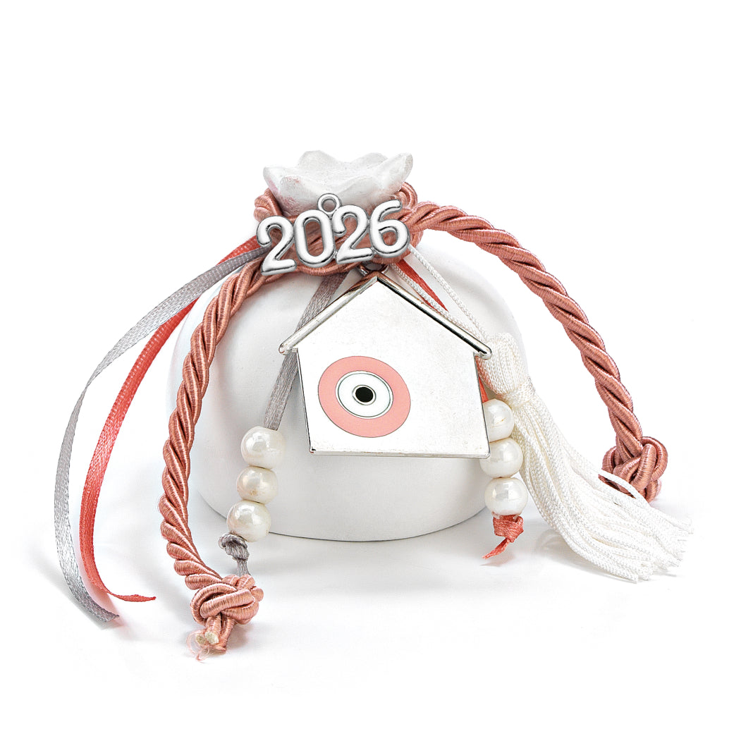 Επιτραπέζιο Χειροποίητο Κεραμικό Ρόδι, άσπρο χρώμα Χριστουγεννιάτικο Γούρι για το 2026  με Ασημί Σπιτάκι με Ροζ Μάτι, κορδέλες, μεταλλική χρονολογία 2026 και φούντα. Η διάσταση του είναι 7,5Χ7εκ.