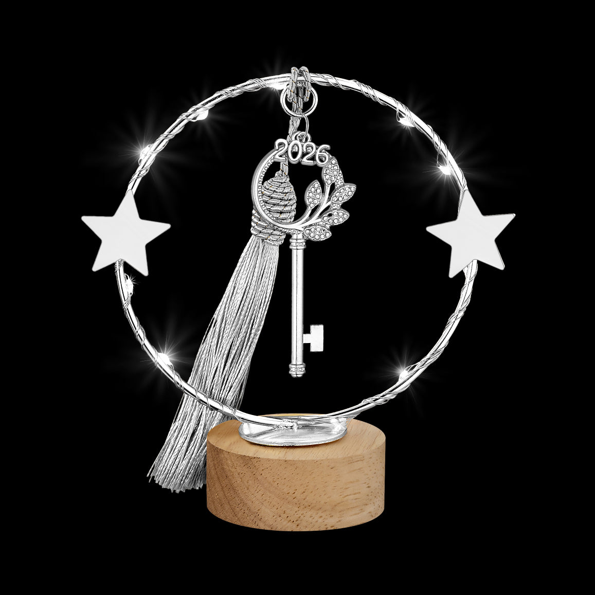 Φωτιζόμενο Γούρι 2026 με Μεταλλικό κλειδί φύλλα με στρας & Αστέρια σε ξύλινη βάση.