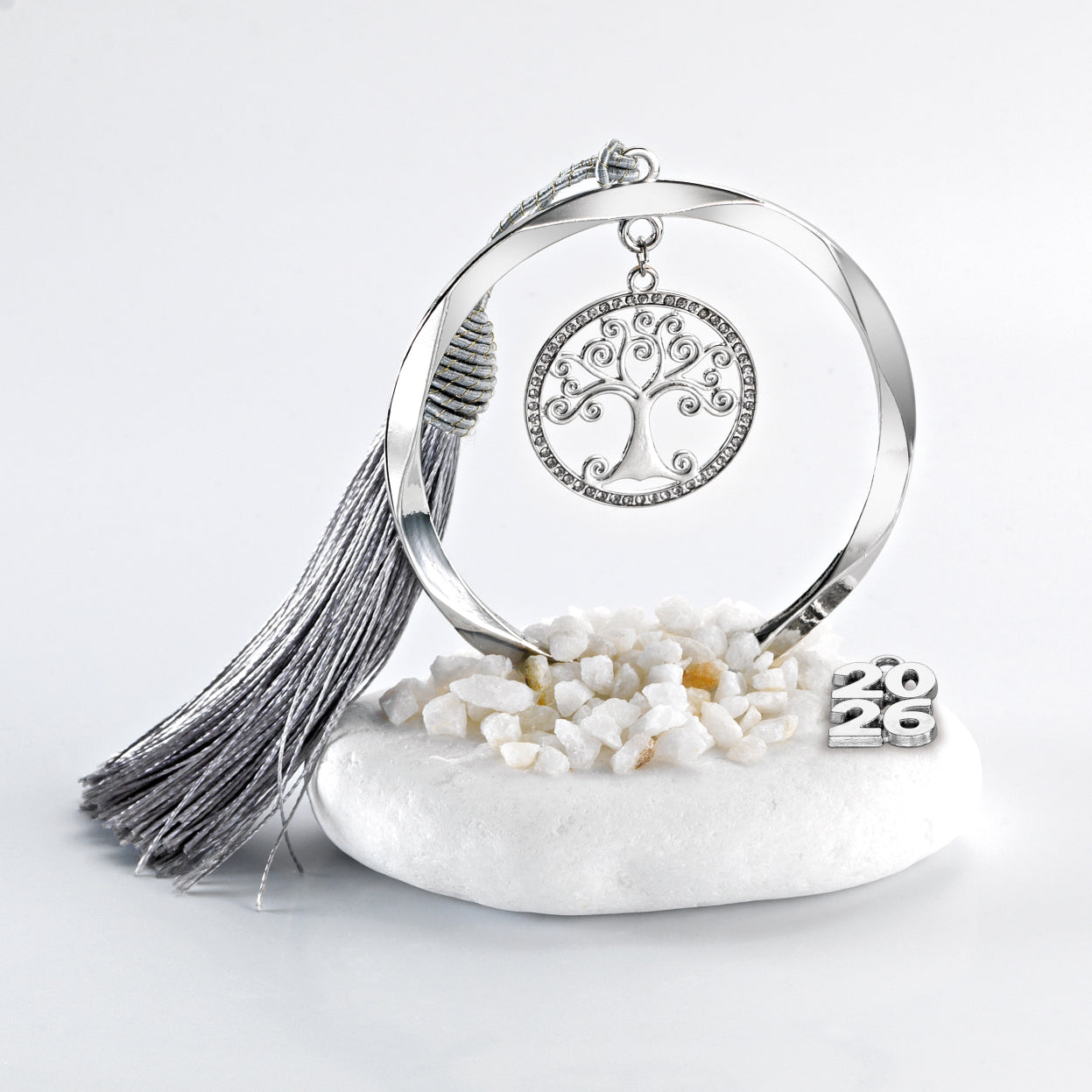 Χειροποίητο Επιτραπέζιο Γούρι 2026 βότσαλο με μεταλλικό κύκλο ασημένιο, φούντα & Δέντρο σε κύκλο με Στρας Ασημί χρώμα περίπου Υ9εκ.