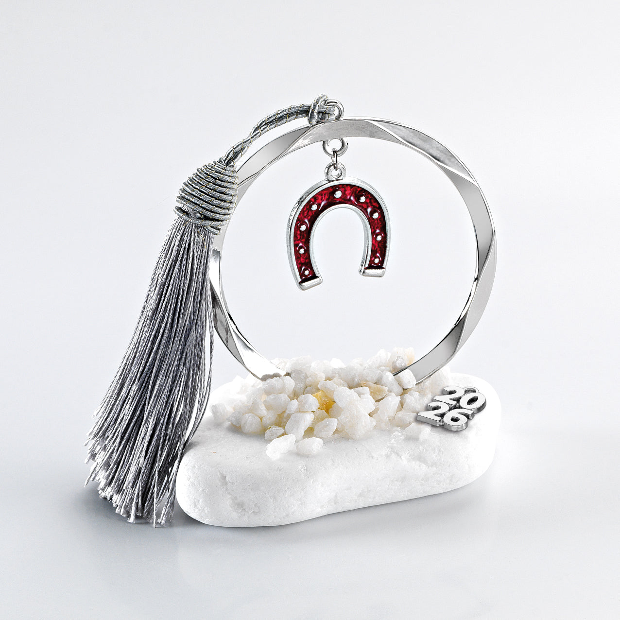 Χειροποίητο Επιτραπέζιο Γούρι 2026 βότσαλο με μεταλλικό κύκλο ασημένιο, φούντα & Πέταλο Μπορντό χρώμα περίπου Υ9εκ.