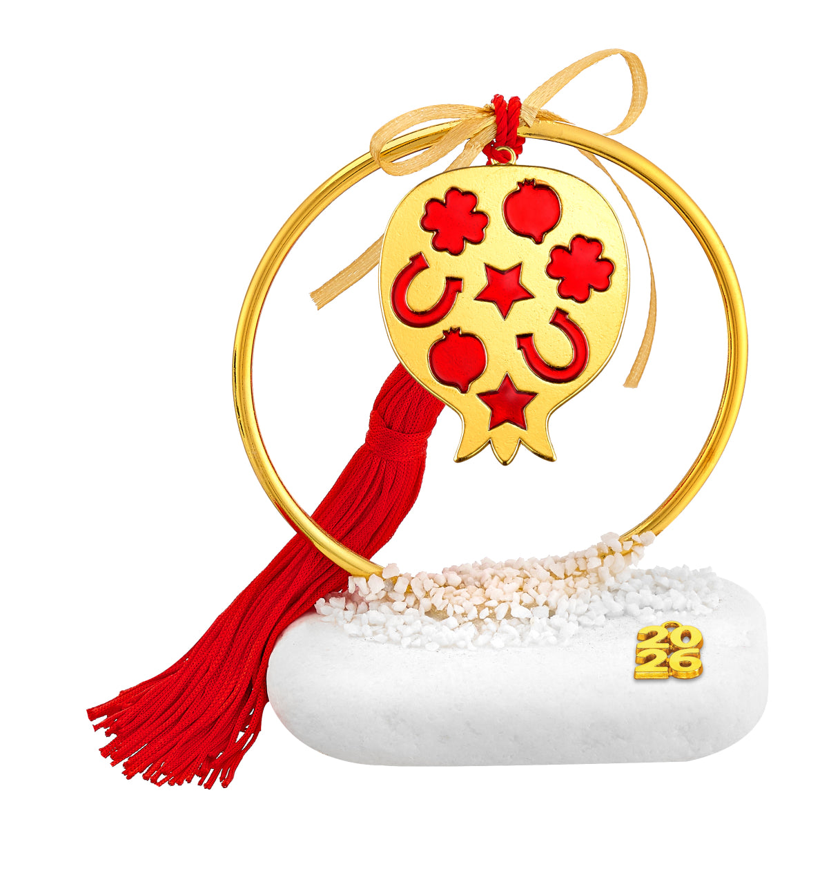 Χειροποίητο γούρι 2026 σε βότσαλο Μεταλλικό Ρόδι με σχέδια σε κύκλο Δ10 & Κόκκινη Φούντα. Αυτό το γούρι αποπνέει πολυτέλεια, προστασία και θετική ενέργεια για το νέο έτος.