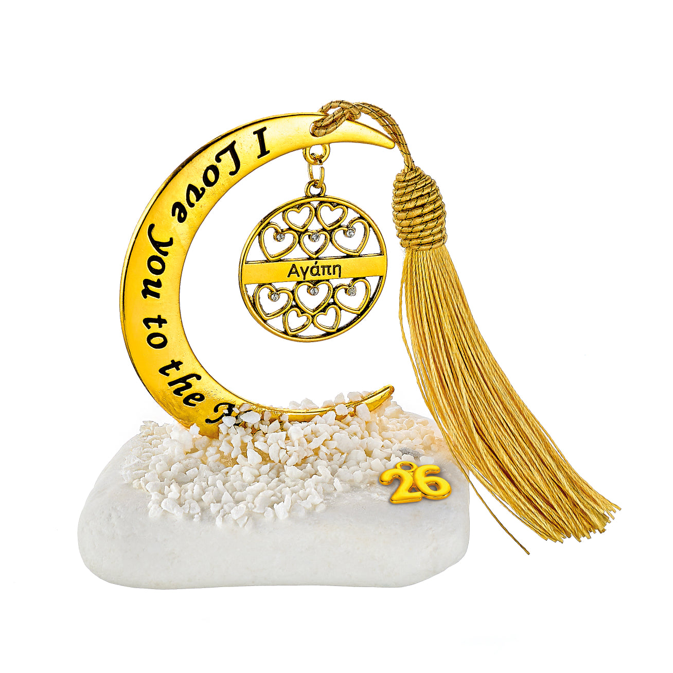 Χειροποίητο Επιτραπέζιο Γούρι 2026 σε βότσαλο με μεταλλικό χρυσό Μισοφέγγαρο 7X8εκ & μεταλλικός Κύκλος με Καρδούλες Αγάπη χρυσό χρώμα 3,5Χ3,5εκ και φούντα. Συνολικό ύψος περίπου Υ10εκ.