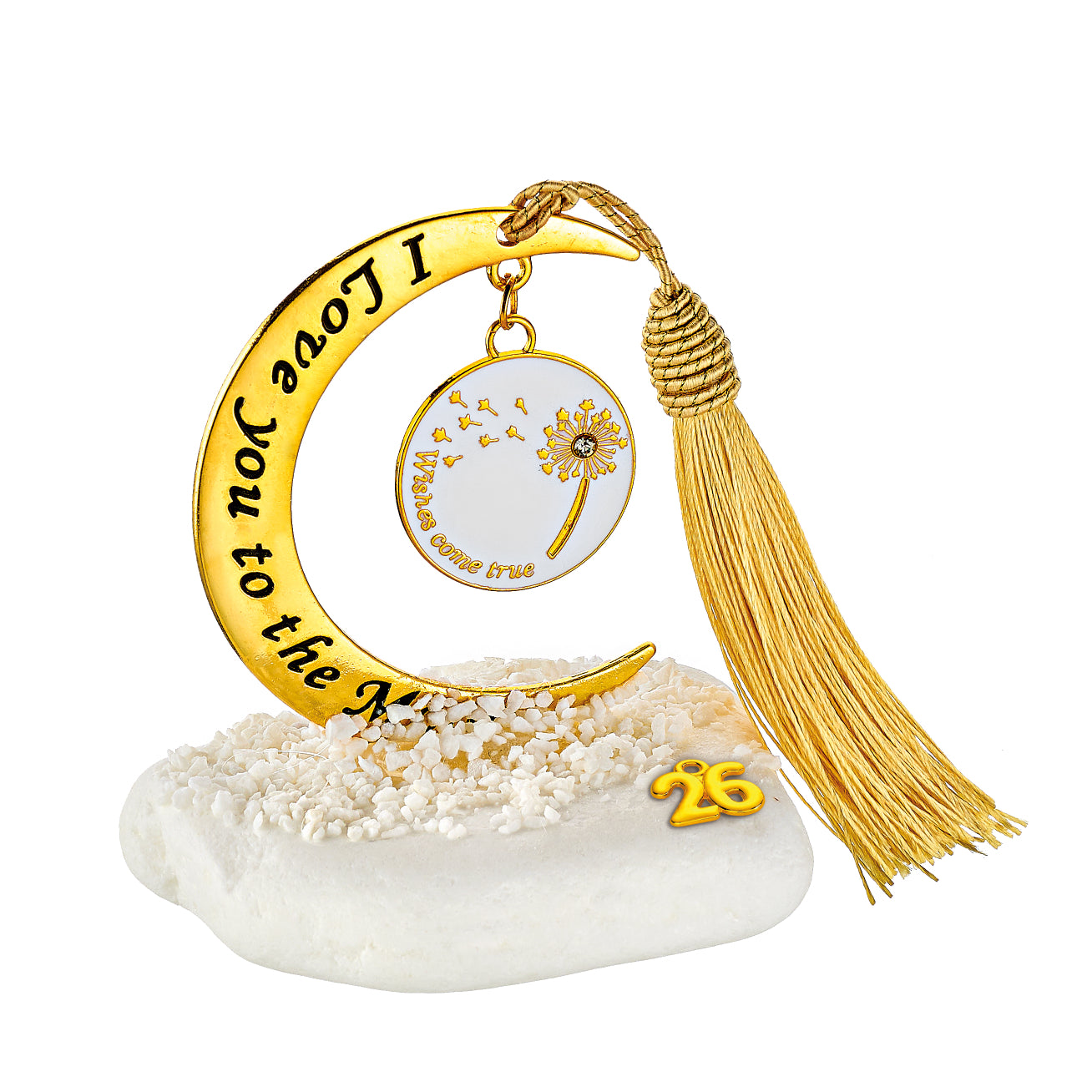 Χειροποίητο Επιτραπέζιο Γούρι 2026 σε βότσαλο με μεταλλικό χρυσό Μισοφέγγαρο 7X8εκ & Στρογγυλό λευκό Διακοσμητικό με Λουλούδι 3Χ3,5εκ και φούντα. Συνολικό ύψος περίπου Υ10εκ.