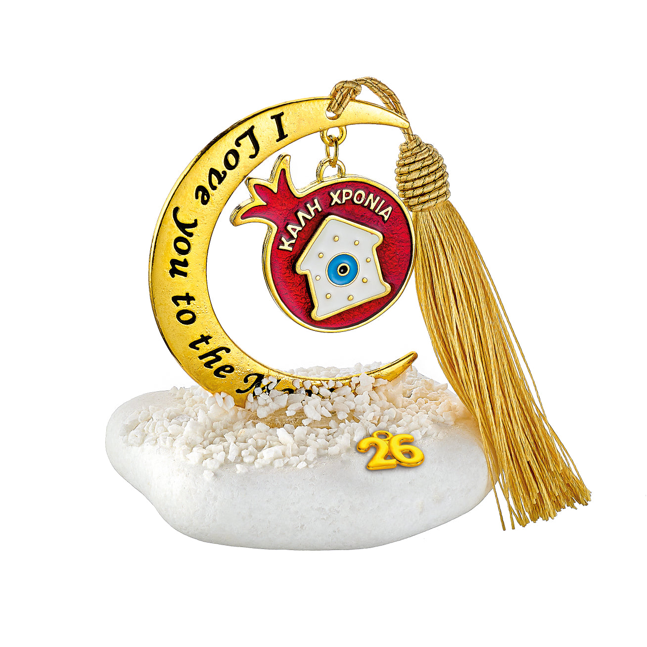 Χειροποίητο Επιτραπέζιο Γούρι 2026 σε βότσαλο με μεταλλικό χρυσό Μισοφέγγαρο I love you to the moon 7X8εκ & Ρόδι σμάλτο κόκκινο με Σπιτάκι με Ματάκι Καλή Χρονιά 4Χ5εκ και φούντα. Συνολικό ύψος περίπου Υ10εκ.