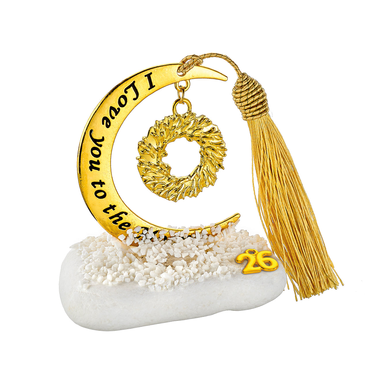 Χειροποίητο Επιτραπέζιο Γούρι 2026 σε βότσαλο με μεταλλικό χρυσό Μισοφέγγαρο I love you to the moon 7X8εκ & μεταλλικό Στεφάνι χρυσό χρώμα 3,7Χ4,4εκ και φούντα. Συνολικό ύψος περίπου Υ10εκ.