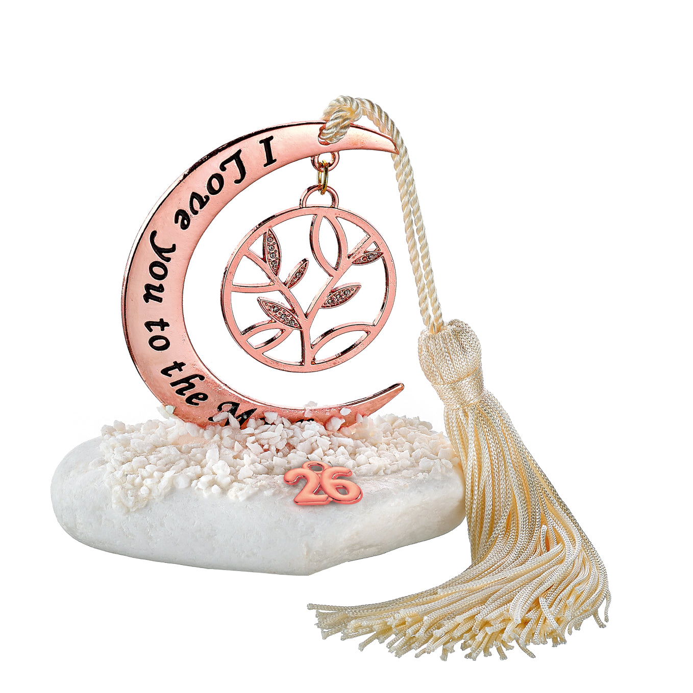 Χειροποίητο Επιτραπέζιο Γούρι 2026 σε βότσαλο με μεταλλικό ροζ χρυσό Μισοφέγγαρο I love you to the moon 7X8εκ & μεταλλικό Δέντρο Ζωής σε Κύκλο ροζ χρυσό χρώμα 4Χ4,5εκ και φούντα. Συνολικό ύψος περίπου Υ10εκ.