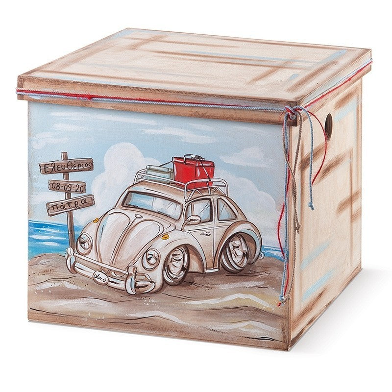 Χειροποίητο Σετ βαπτιστικών Ξύλινος natural κύβος, συσκευασία βάπτισης ζωγραφισμένη στο χέρι με θέμα τον ταξιδιάρη σκαραβαίο. Το μπροστινό μέρος του κύβου είναι ζωγραφισμένο με σκαραβαίο φορτωμένο με βαλίτσες δίπλα στη θάλασσα και με δυνατότητα αναγραφής δίπλα, σε στυλ πινακίδας ,του ονόματος , της ημερομηνίας και της τοποθεσίας του παιδιού που βαπτίζεται. Το καπάκι του κύβου διακοσμείται περιμετρικά με κορδόνι μπεζ-κόκκινο και σιέλ ενώ όλος ο κύβος έχει σβησίματα σε καφέ και σιέλ αποχρώσεις.