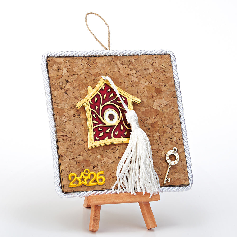 Eπιτραπέζιο Γούρι 2026 Πίνακας Φελλού 11εκ σε Καβαλέτο & Μεταλλικός Σπιτάκι με Μάτι 5.7Χ6,2 εκ. Συνολικό Ύψος περίπου 14εκ.