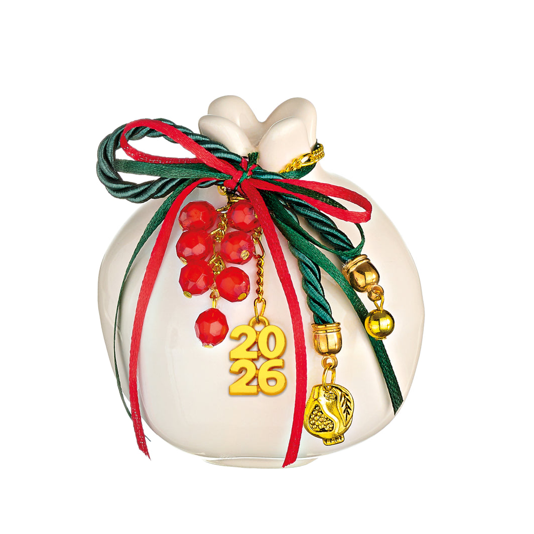 Επιτραπέζιο Χειροποίητο Κεραμικό Ρόδι γυαλιστερό Γούρι για το 2026 με Κόκκινο Φύλλο Χαντρών  κυπαρισσί κορδόνι, μεταλλική χρονολογία 2026 και μεταλλικό ροδάκι. Η διάσταση του είναι 8Χ10εκ