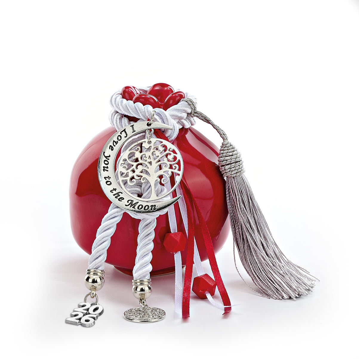 Επιτραπέζιο Χειροποίητο Κεραμικό Ρόδι γυαλιστερό σε κόκκινο χρώμα, Γούρι για το 2026με Μεταλλικό Δέντρο Ζωής σε Μισοφέγγαρο ασημί 4,2Χ5εκ, κορδόνι, χάντρες, μεταλλική χρονολογία 2026, και φούντα. Η διάσταση του είναι 7Χ8,5εκ